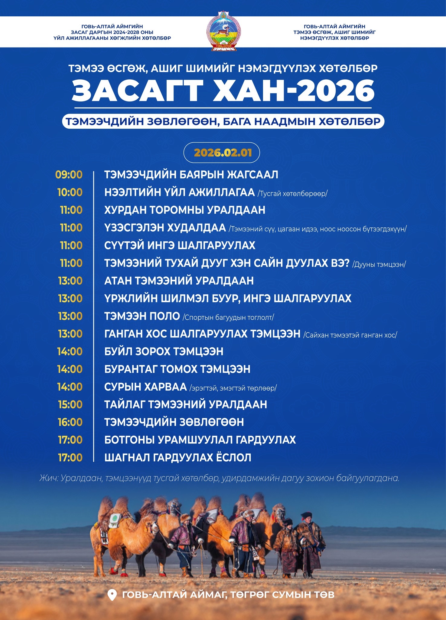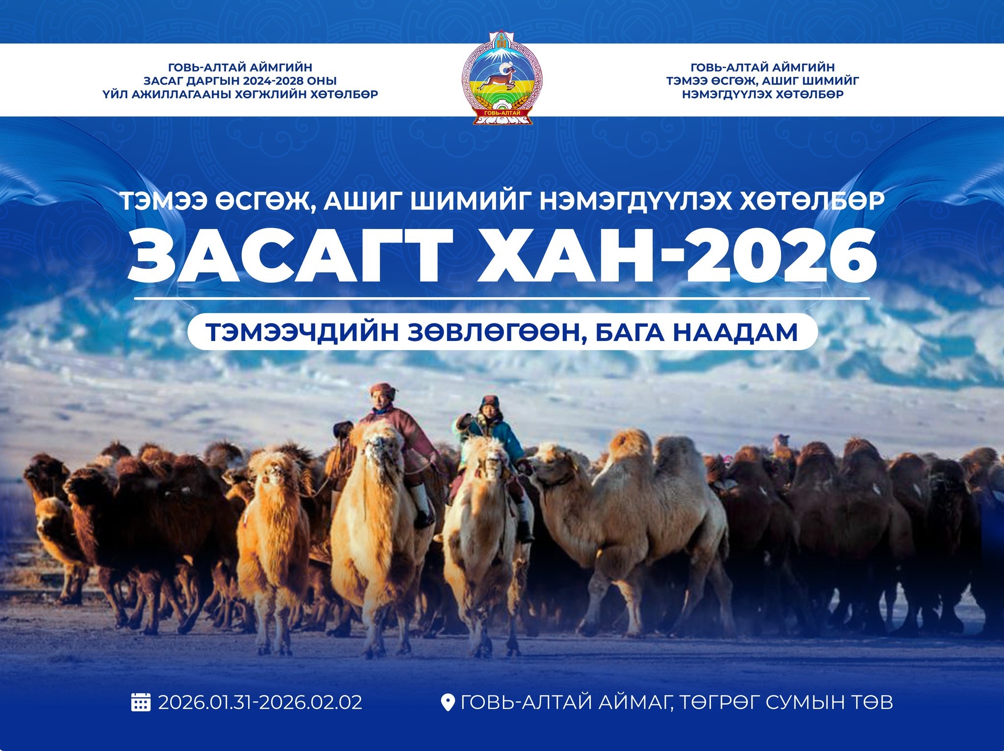 Аймгийн Засаг дарга Гомбосүрэнгийн Чинбатын “2024-2028 оны үйл ажиллагааны хөгжлийн хөтөлбөр”, “Тэмээн сүргийг өсгөж, ашиг шимийг нэмэгдүүлэх хөтөлбөр”-ийн хүрээнд “ЗАСАГТ ХАН-2026” тэмээчдийн зөвлөгөөн, бага наадам 2026 оны 01 дүгээр сарын 31-ээс 02 дугаар сарын 02-ны өдрүүдэд Говь-Алтай аймгийн Төгрөг сумын төвд зохион байгуулагдана.